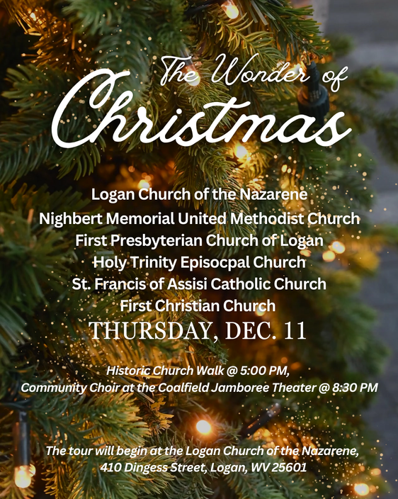 The Wonder of Christmas Historic Church Walk is free and open to anyone who wishes to attend. The walk will begin at 5:00 PM at the Logan Church of the Nazarene, located at 410 Dingess Street, Logan, WV 25601. The following churches will be visited in the order listed: